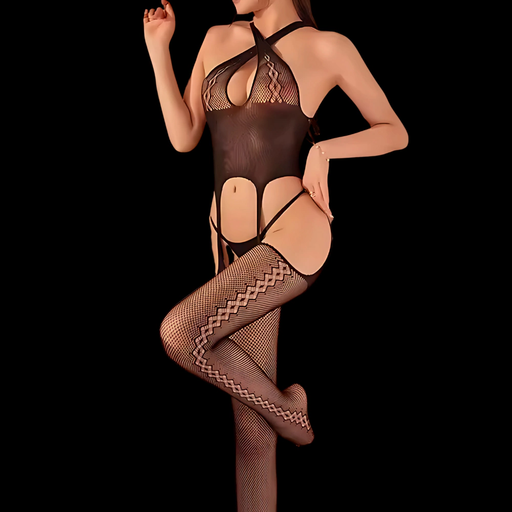 Se o seu desejo é impactar com sofisticação e ousadia, este macacão feminino em trama floral é a peça ideal. Com recortes estratégicos e alças cruzadas que contornam o pescoço, ele valoriza a silhueta com elegância e oferece um visual moderno e provocante. A malha elástica proporciona ajuste perfeito ao corpo e liberdade total de movimentos, enquanto os detalhes vazados nas pernas e nas laterais revelam a sensualidade de forma sutil.