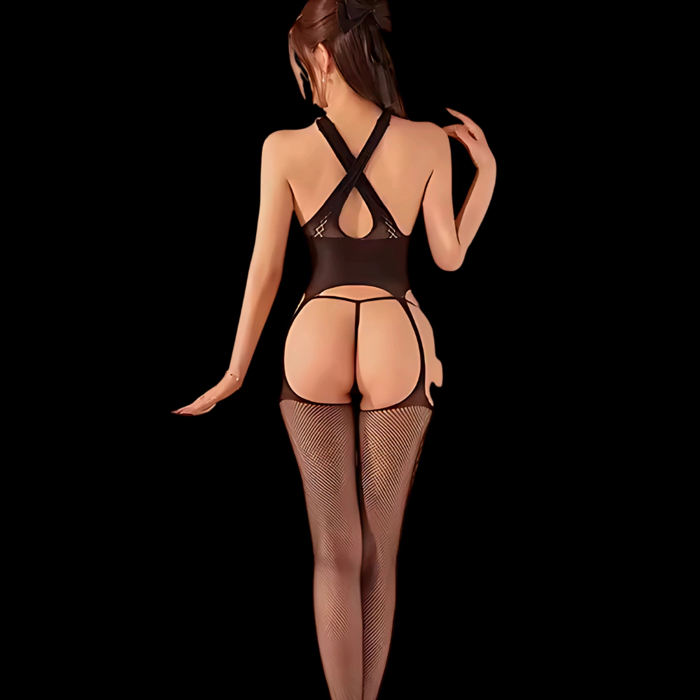 Modo de uso: Vista a peça cuidadosamente pelas pernas e ajuste as alças cruzadas ao redor do pescoço, certificando-se de acomodar bem os recortes.