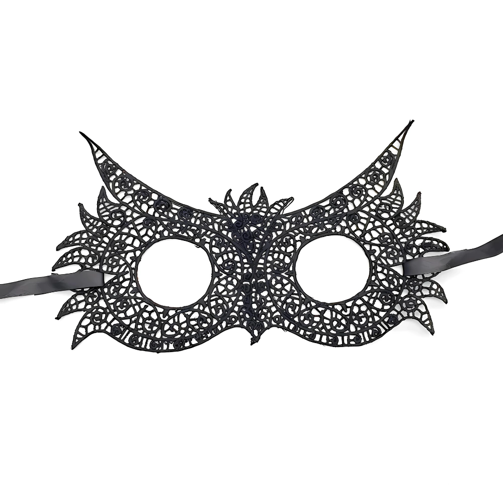 Com um design impactante e formato único que evoca asas ou orelhas de criatura noturna, essa máscara para baile de fantasias é a escolha perfeita para quem deseja dominar a cena com mistério e presença. Os recortes circulares reforçam o olhar direto e hipnótico, enquanto as pontas elevadas criam um efeito visual ousado.